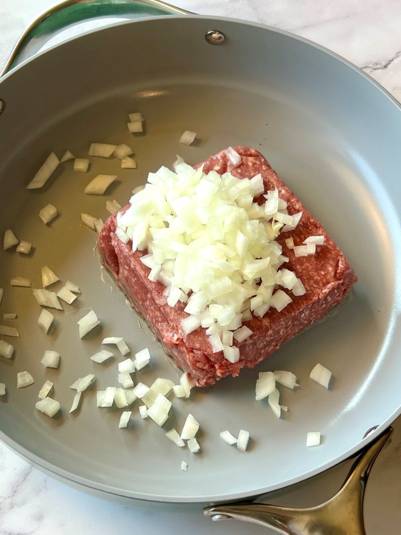 - Heat a large skillet to medium heat and add ground beef and onion. Cook and crumble meat until no longer pink, then stir in garlic powder, dried mustard, kosher salt, black pepper, and Worcestershire sauce. Cook 2 minutes more then pull off the heat.