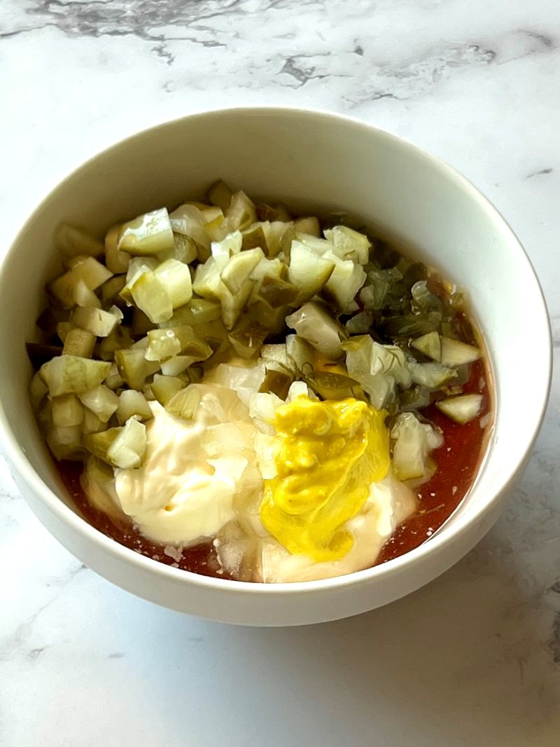 - Big Mac sauce– Mayo, ketchup, mustard, sweet relish, dill pickles, onions, and pickle juice.