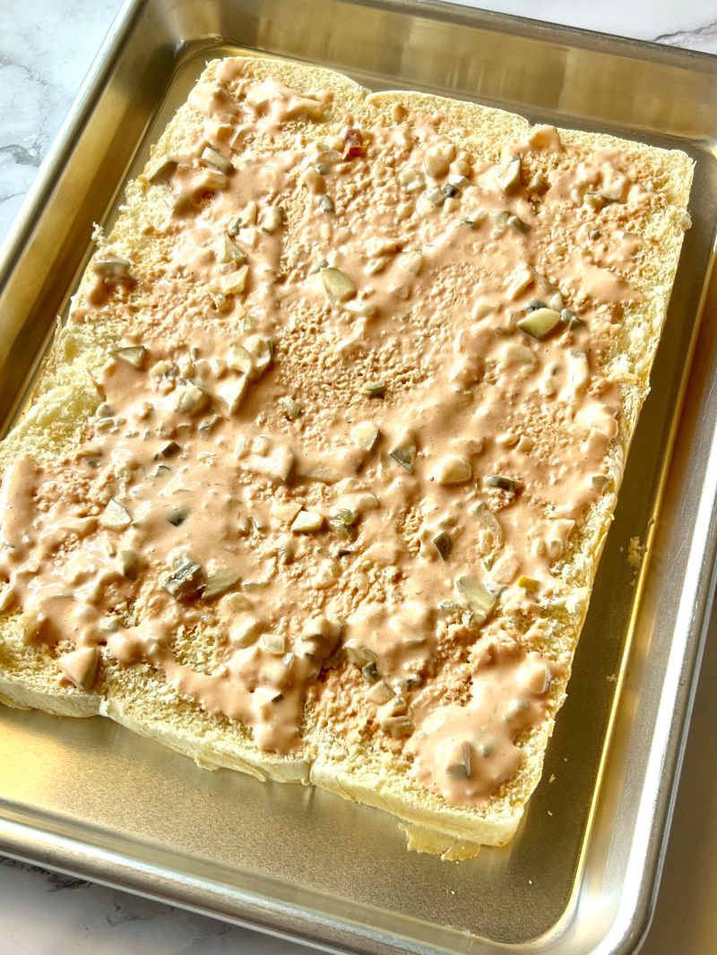 - Slice the buns in half horizontally without separating them and place the bottom half face up on a sheet pan.