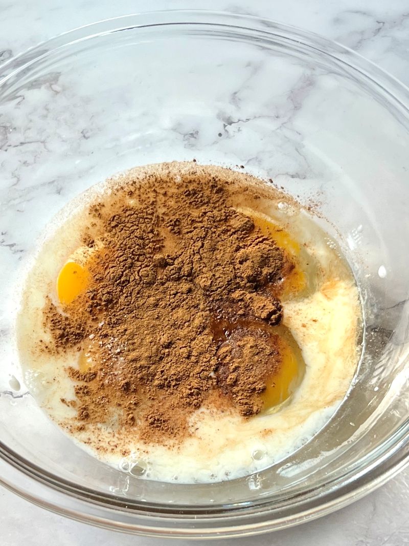 - Use a whisk to combine 4 eggs, 1/3 cup milk, 2 tsp ground cinnamon, 1/4 tsp nutmeg, 1/4 tsp kosher salt, 1 tsp vanilla extract, and 1/2 tsp maple extract in a medium mixing bowl until well mixed.