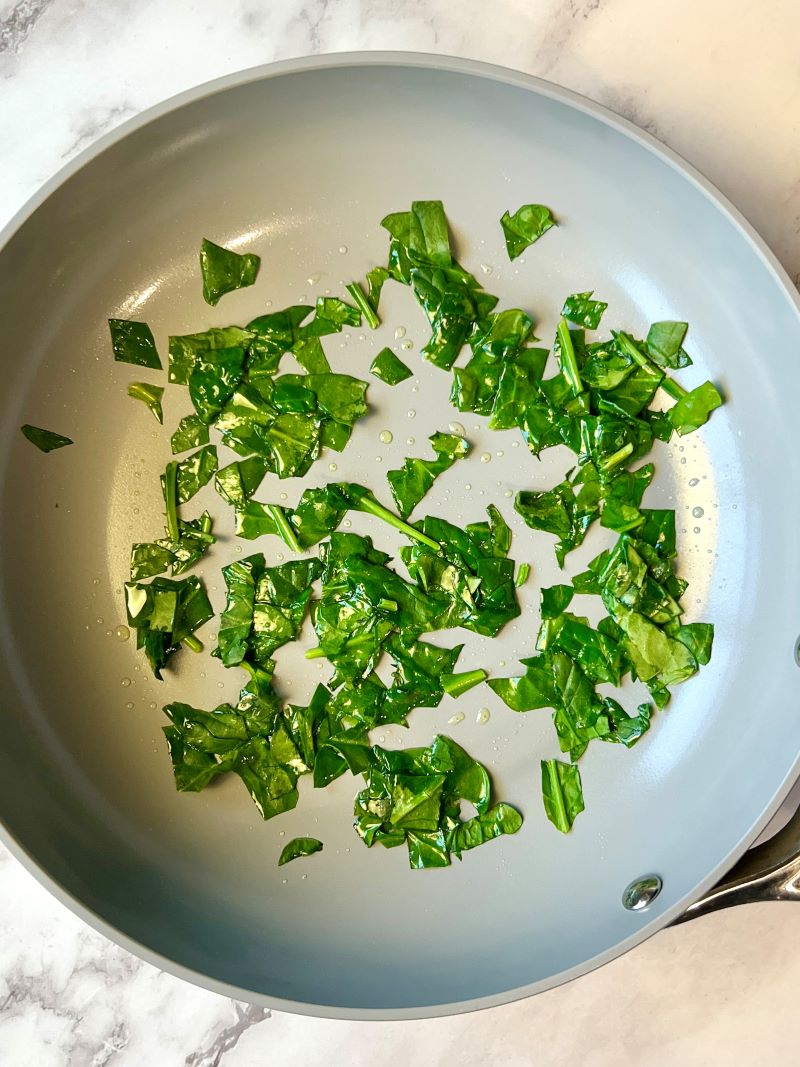 Step One. Heat a medium skillet to medium low heat and sauté the spinach until wilted. Pour in whisked eggs and seasonings and swirl the eggs around the pan.