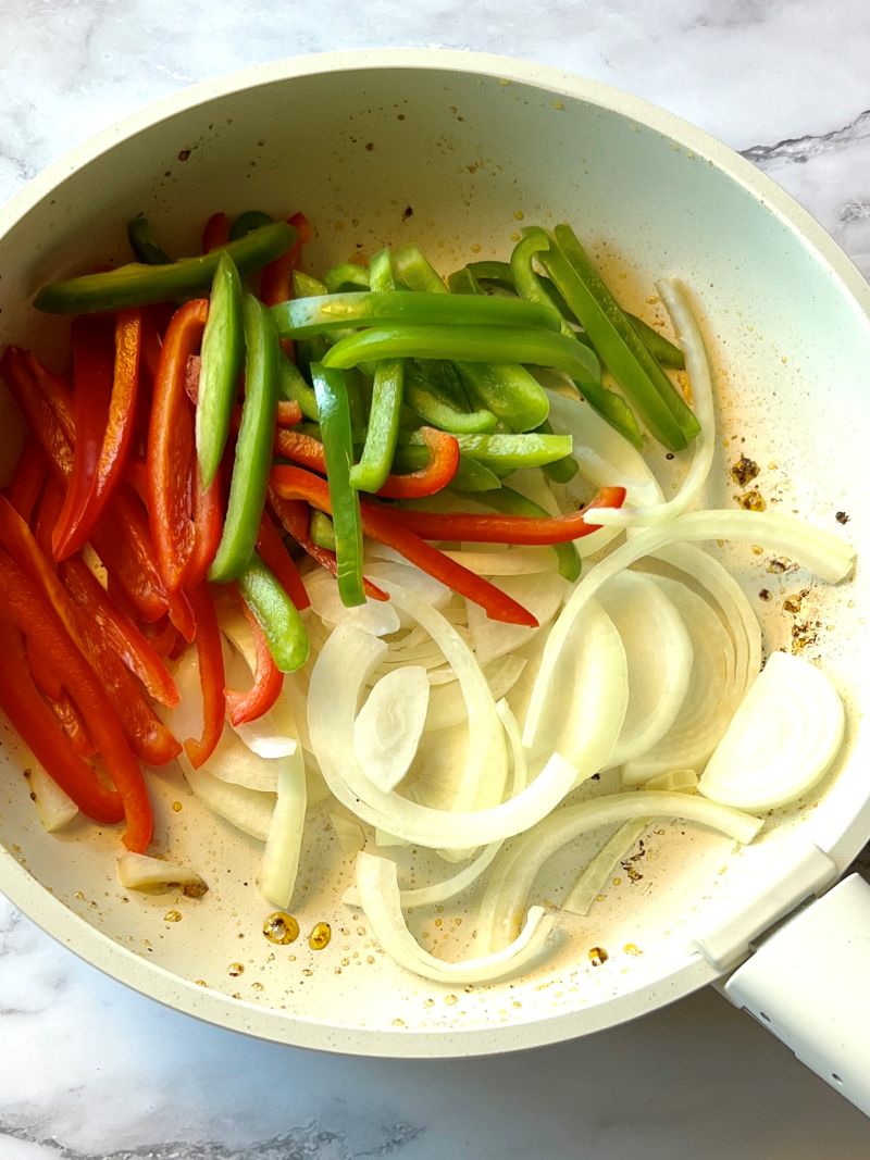 - To the hot skillet add onions and bell peppers. Sauté for 2-3 minutes. Not too long, they will continue to cook in the oven. Toss in zucchini and cook another 2-3 minutes.