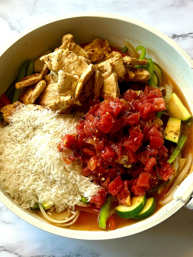 - Next add chicken back to the skillet along with white rice, tomatoes and green chiles, and chicken broth. Stir to combine and bring to a simmer. Note: Make sure all the rice is submerged in the broth. Add a splash more liquid to make sure the rice is covered.