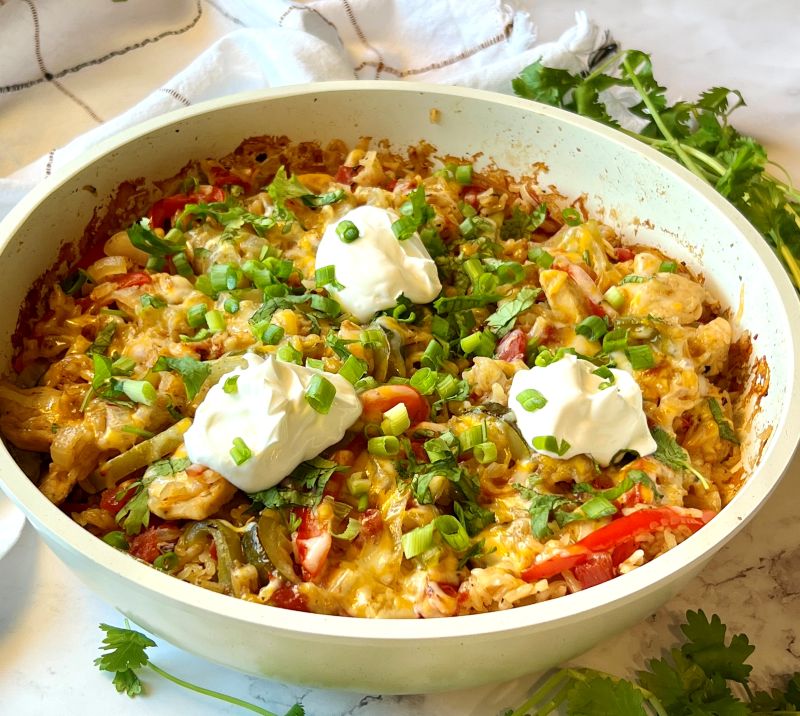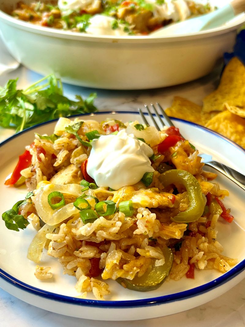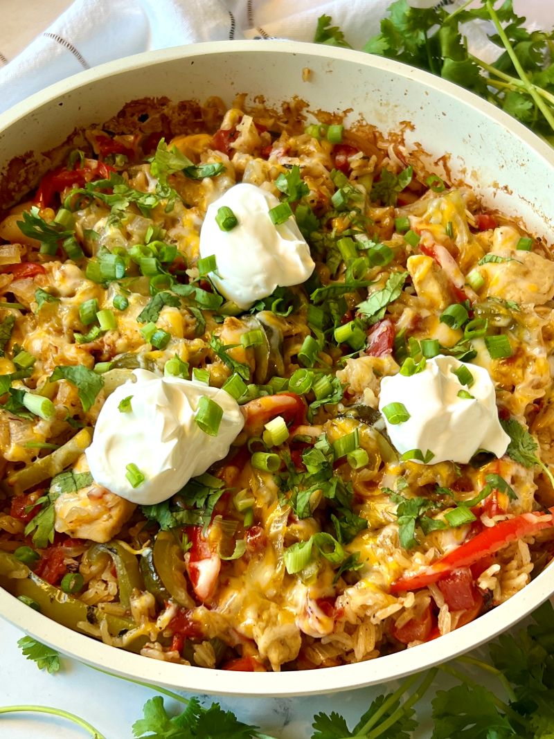 I am loving this season of small-batch meals. Like my One-Skillet Salmon with Orzo or Slow Cooker Taco Stuffed Peppers. It's just my husband and I and we are always on the lookout for delicious, low-effort dinner ideas that don't require a huge pan and leftovers for days. This Easy Chicken Fajita Casserole is made in just one-skillet and it's the perfect amount for two people with a little leftover. It has all the yummy fajita goodies baked with rice and cheese. We love to serve this with cool sour cream, fresh cilantro and a side of tortilla chips for some crunch. Healthy and so good!