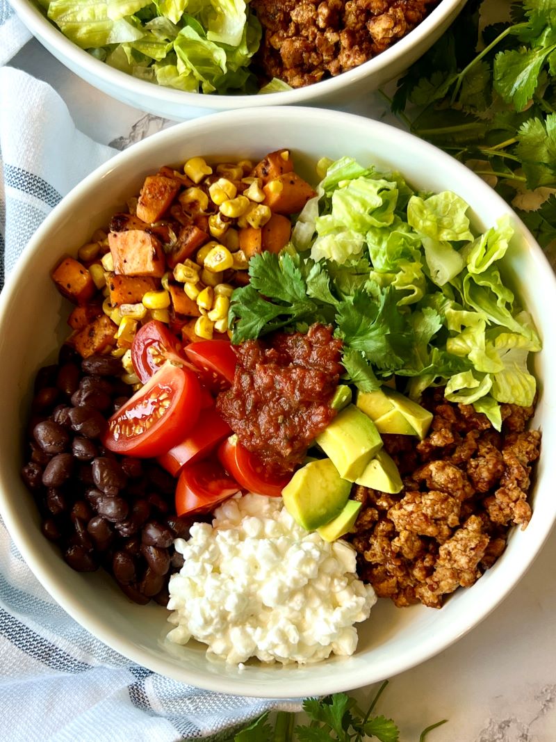 Ground Turkey Power Bowls featuring seasoned ground turkey, roasted sweet potatoes and corn, cottage cheese, black beans, and plenty of fresh toppings. This meal is packed with protein, fiber, and healthy fats to keep you full for hours.