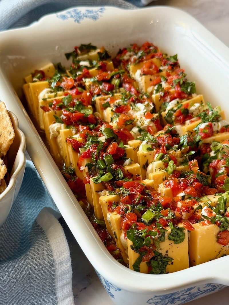 It’s a gorgeous appetizer with layers of color and texture, but the real magic is in the flavor. The bright, zesty marinade and the mix of cheeses make it completely addictive. And aside from a bit of slicing, it’s incredibly easy to assemble.