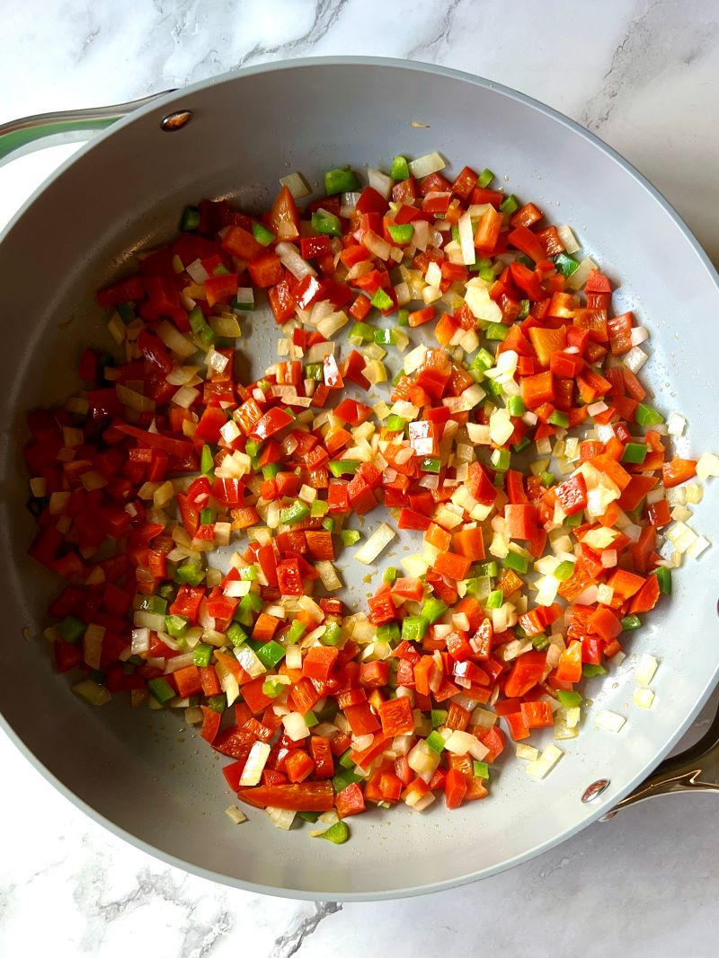 - Heat a large skillet to medium heat. Add olive oil, onions, red bell pepper, and jalapeno. Sauté for 3-4 minutes until softened. 1 tablespoon olive oil½ cup onions, diced1 large red bell pepper, diced1 medium jalapeno, seeded and diced