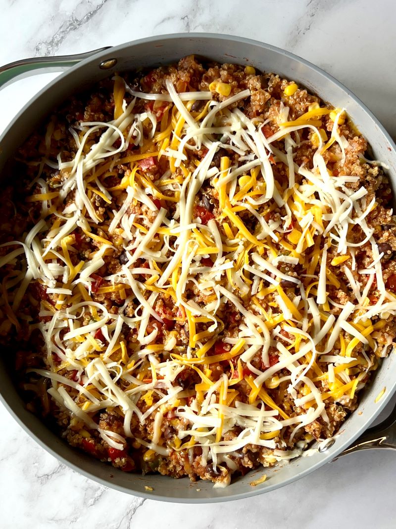 - Stir in black beans and taco seasoning. Toast the seasoning for 30-seconds then stir in salsa, half of the cheese, and cooked quinoa until fully combined. 1 can black beans, drained and rinsed2 tablespoon taco seasoning1 15 oz jar chunky salsa½ cup Monterey Jack cheese, shredded½ cup cheddar cheese, shredded4 cups cooked quinoa