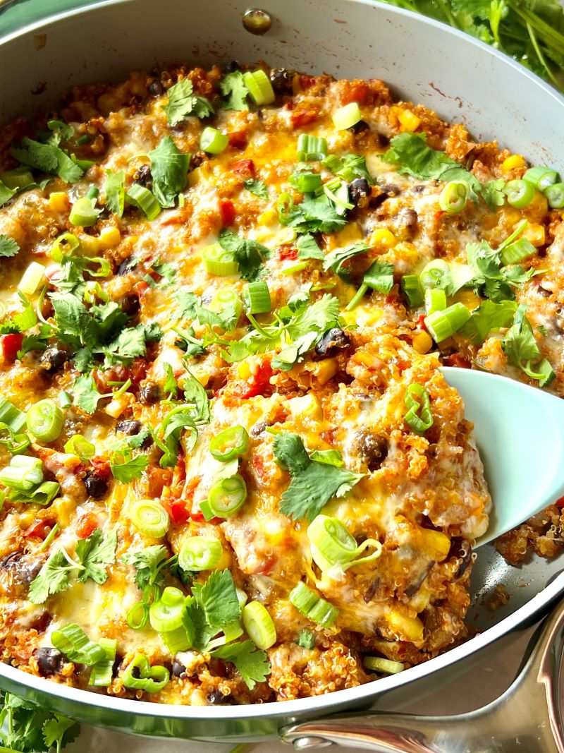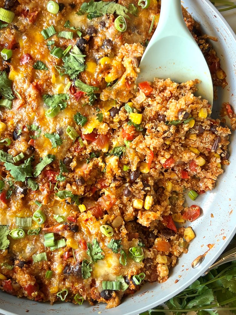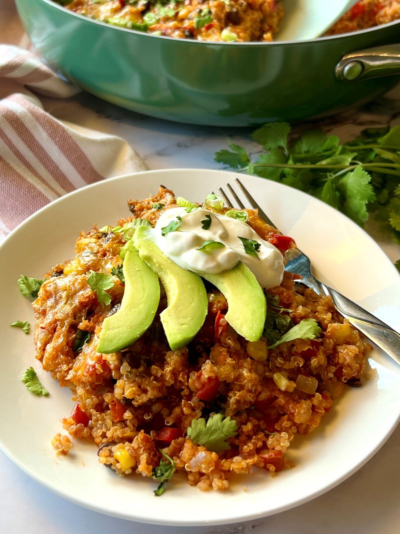 Mexican Quinoa Casserole is a fantastic meal when you want to enjoy a meatless dinner option yet still be filling and delicious. This casserole is perfect for feeding a handful of people. Make sure to set out yummy toppings like fresh avocado, sour cream, and green onions.