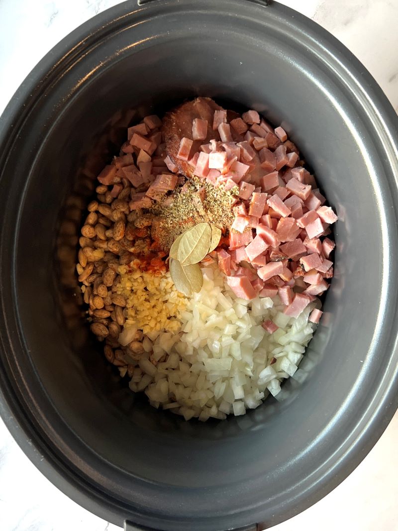 - To the slow cooker add beans, ham, onions, garlic, seasonings (minus the salt) bay leaves, and chicken broth. Stir to combine and place the lid on. Cook on low for 9-10 hours or until beans are tender and soft. If using a ham bone, remove from the slow cooker and pull off any excess meat. Stir the meat into the beans and taste for seasonings. 1 lb dried pinto beans, soaked in cold water overnight1 1/2 cups diced or shredded ham3/4 cup onion, diced3 garlic cloves, minced1 1/2 tsp smoked paprika1/2 tsp ground cumin1 tsp dried oregano2 bay leaves6 cups low-sodium chicken brothkosher salt to taste.