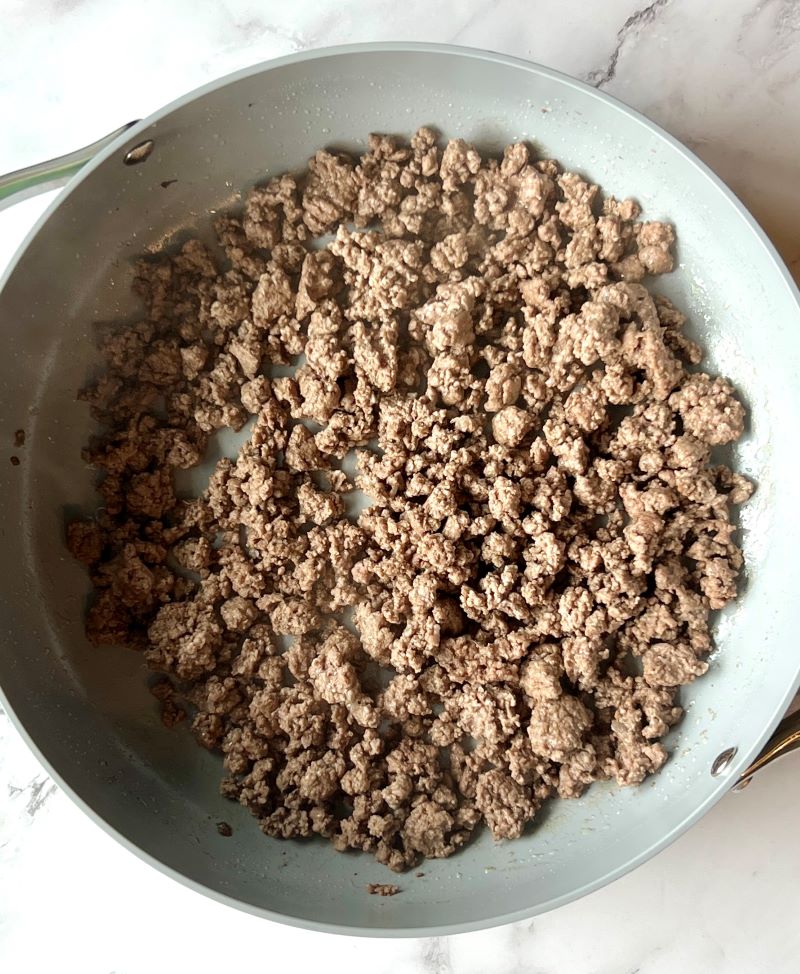 - Brown beef– Crumble and cook the ground beef in a large skillet until no longer pink.