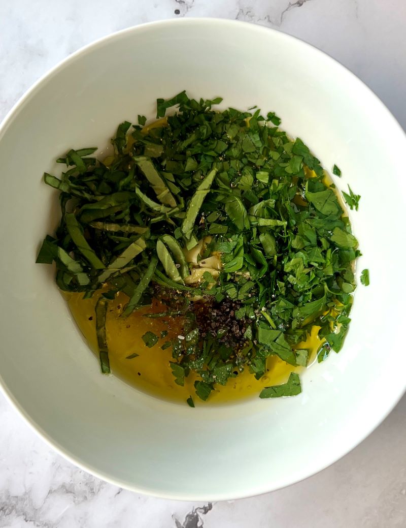 - Lemon dressing– Olive or avocado oil, lemon juice, garlic, Dijon mustard, honey, salt, pepper, fresh parsley and basil.