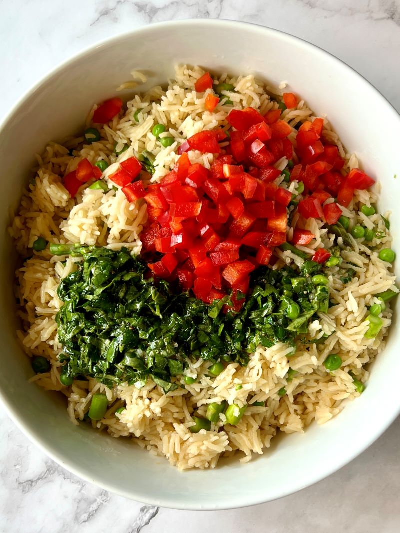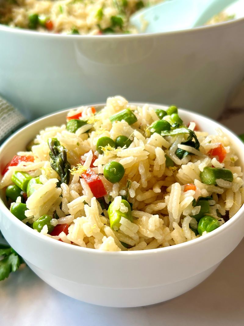 Making this salad is super easy and filled with all good things like basmati rice, which is fragrant and nutty, tender asparagus, sweet peas, and fruity red bell peppers for freshness and crunch. The zesty lemon herb dressing adds a tangy touch, bringing life to the whole dish.