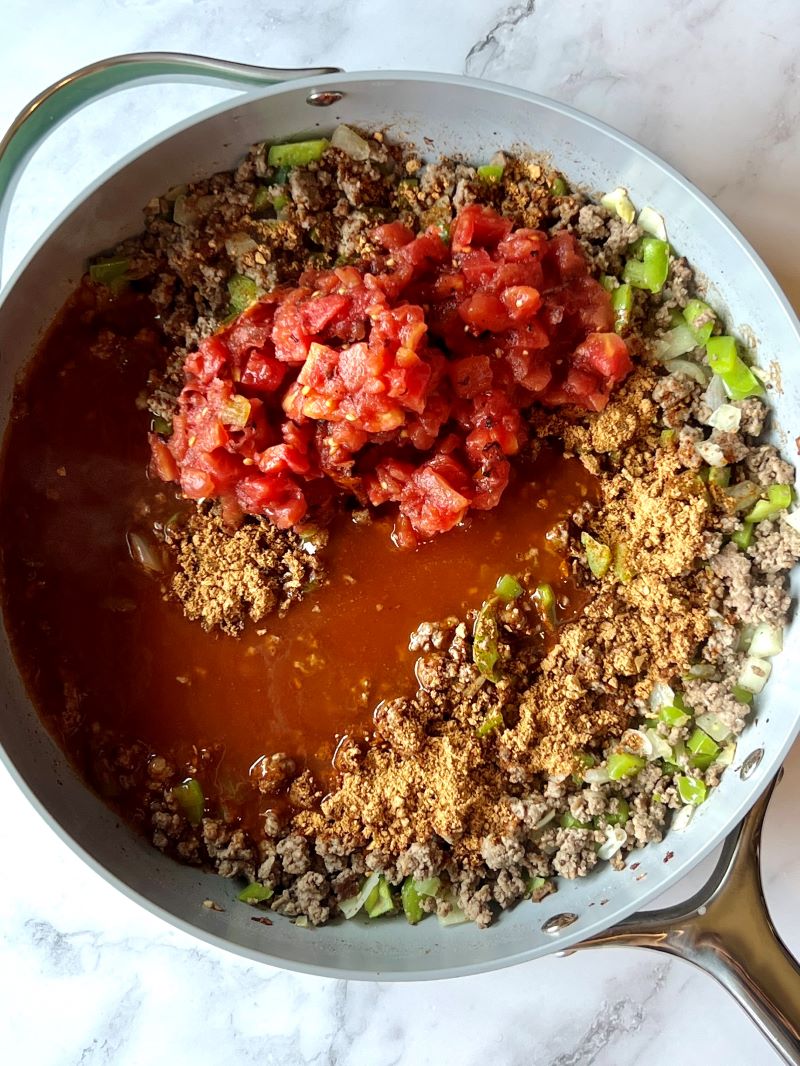 - To the cooked ground beef and veggies add 1 packet taco seasoning, 1 can tomatoes with green chiles, and 1 can mild enchilada sauce. Stir to combine and continue to simmer and cook until mixture thickens, about 5 minutes. Season with salt and pepper if needed.